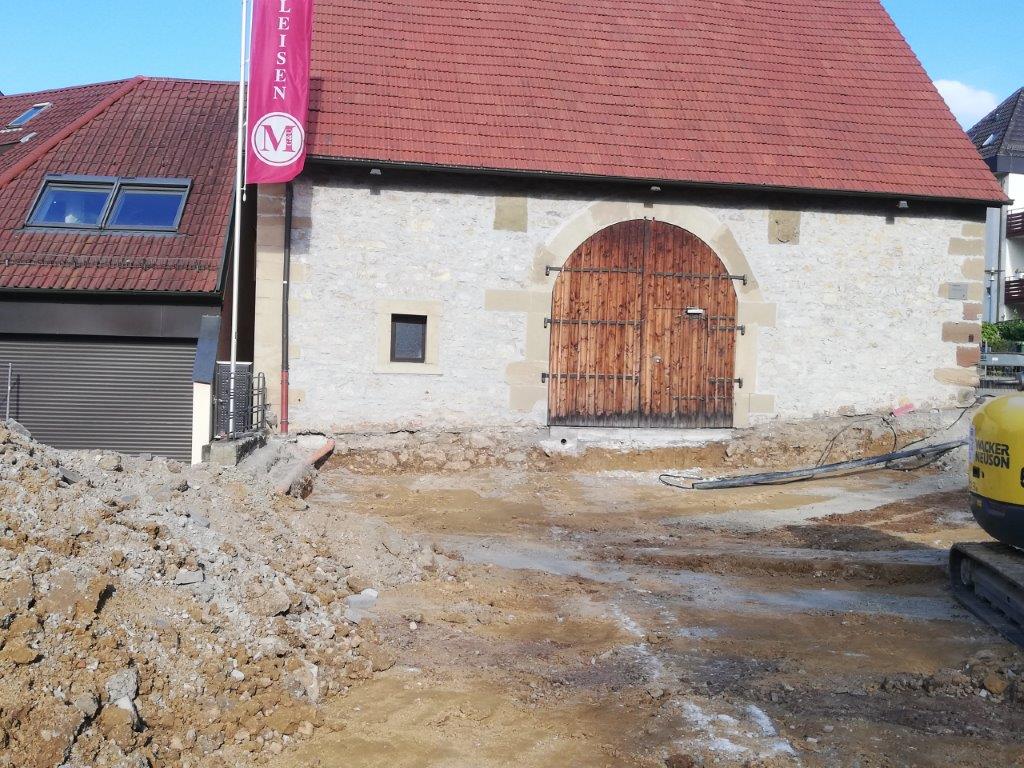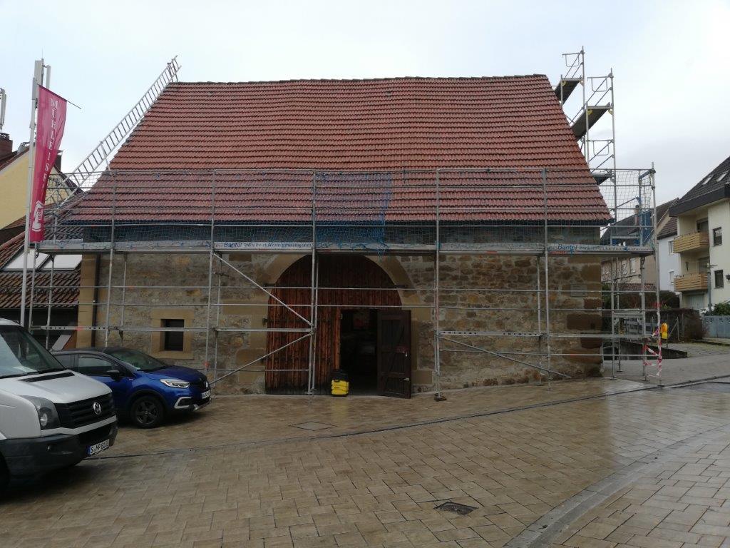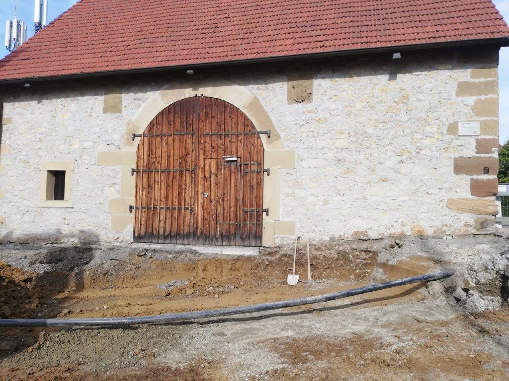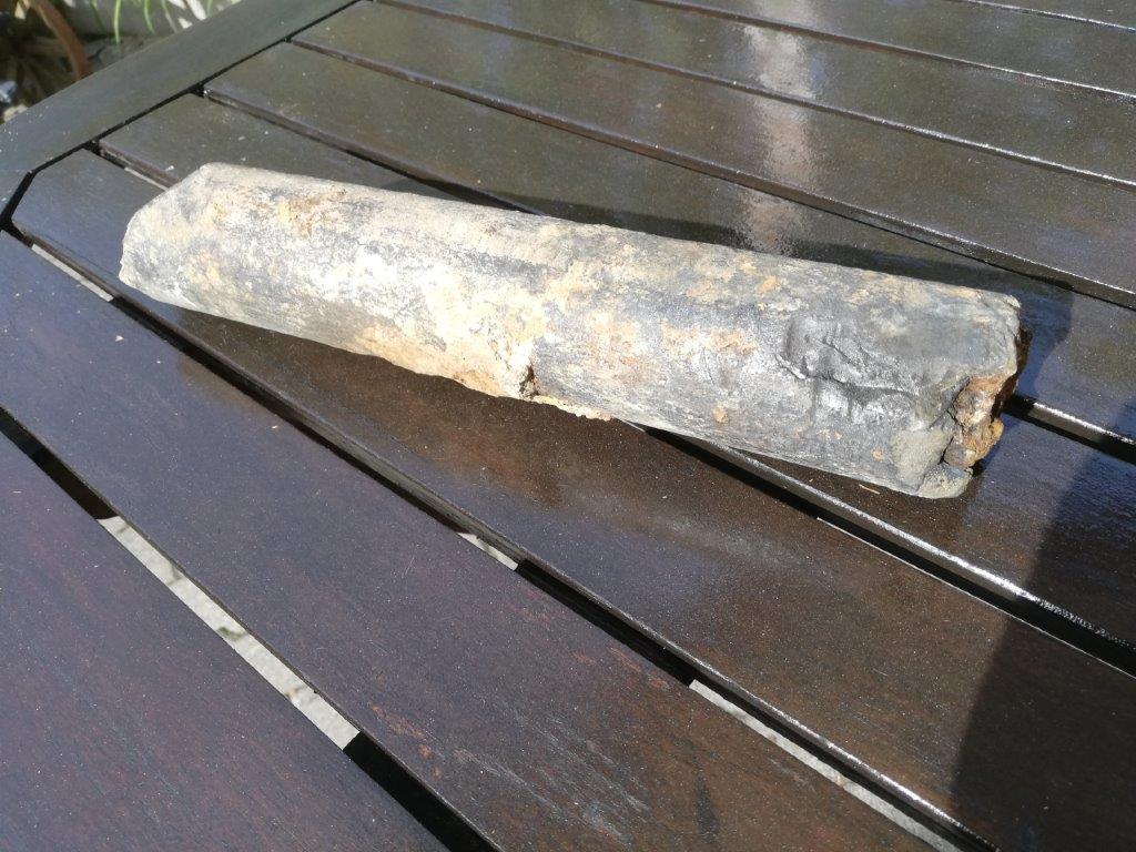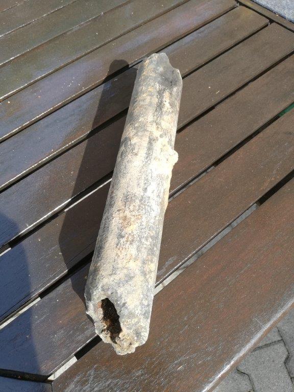 September 2019 - Beim Ausbaggern vor der Zehntscheuer wurden Fragmente einer Stabbrandbombe aus dem II. Weltkrieg gefunden. Es handelt sich dabei vermutlich um eine der Stabbrandbomben, die seinerzeit das alte Walmdach der Zehntscheuer vollständig abbrennen ließ. Die Überreste lagern nun im Ortsarchiv Hofen.